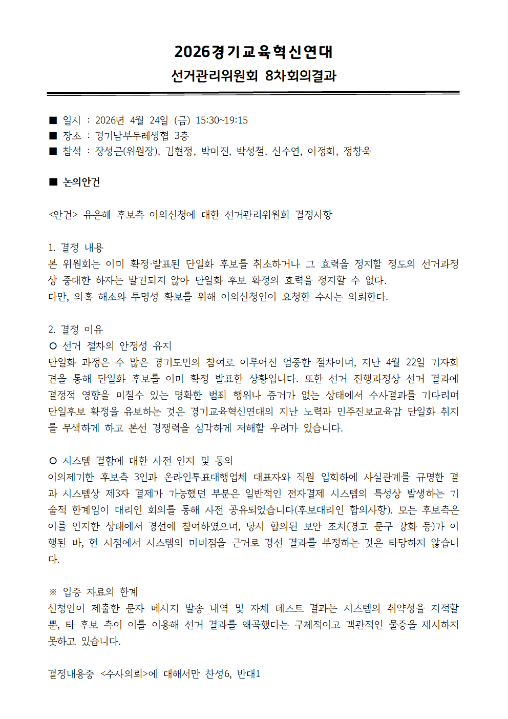 유은혜 후보측 이의신청에 대한 선거관리위원회 결정사항